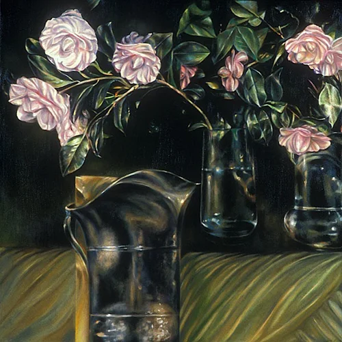 Influenced by Color Field stain painters of American mid-twentieth century painters—in particular, Morris Louis—these paintings are produced in layers of transparent and translucent color. Superimposed on these fields of color, are hard-edged shapes that are either minimal and flat or decorative and floral.