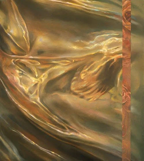 The solo exhibition entitled Balance was exhibited at the Humanities of and Fine Arts Gallery at California State University-Chico (2011). It contained a series of symbolist paintings that conceptually focused upon human relationships: 1) female/male, father/daughter and mother/son. Each relationship contained one of the following garments: haori, regalia and vestment. Balance One focused upon the male/female relationship incorporating a haori, which was a jacket worn by both men and women of Japan. Balance One is a thirteen foot length oil on canvas triptych measuring six feet at its longest height. Side panels are 48”H, 36”W and the center panel is 72”H and 96”’W. The center of the panel depicts a Japanese '“haori”, a unisex shortened kimono. In this painting, the “haori” stands for gender equality between men and women. Sold, private collection.